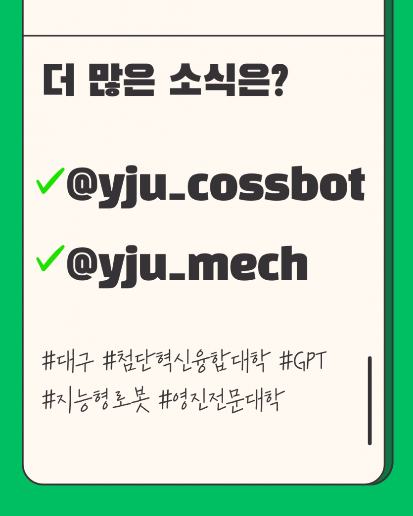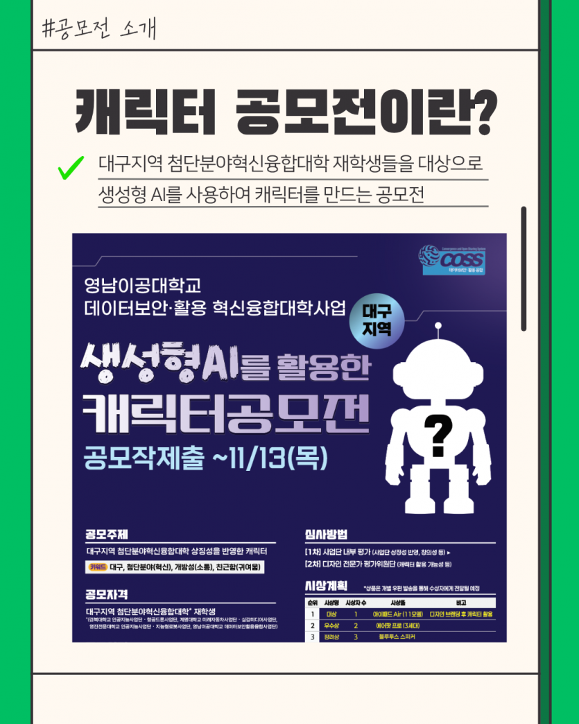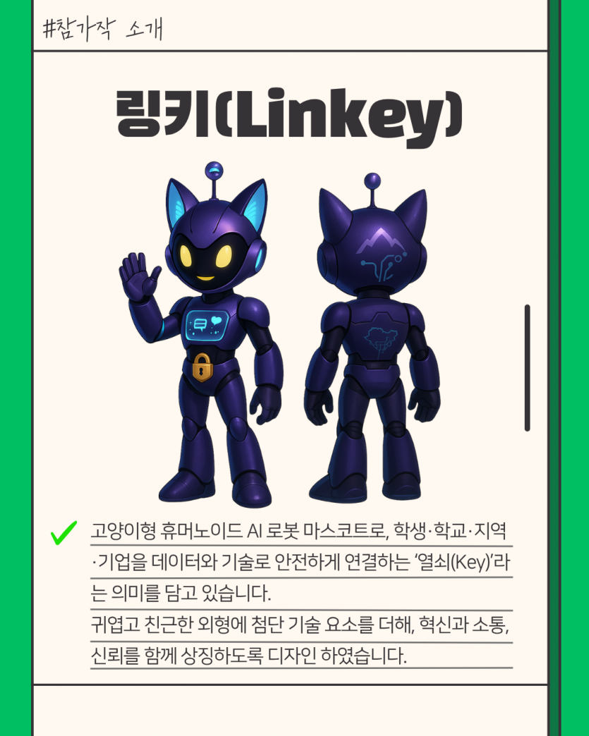 #생성형AI 캐릭터 공모전 공모작 제출 후기✨ 페이지 정보 작성자 지능형로봇사업단 댓글 0건 조회 10회 작성일 25-11-19 14:55 목록 본문 #생성형AI 캐릭터 공모전 공모작 제출 후기✨대구지역 첨단분야혁신융합대학 재학생들을 대상으로 한 ‘생성형 AI 캐릭터 공모전’에 저도 직접 참여해봤어요.제가 만든 캐릭터는 고양이형 휴머노이드 AI 로봇, ‘링키(LinKey)’ 입니다. 학생·학교·지역·기업을 데이터와 기술로 안전하게 연결해 주는 ‘열쇠(Key)’라는 의미를 담아서 디자인했어요 관련링크 https://www.instagram.com/p/DROheNtkjBm/?utm_source=ig_web_copy_link&i… 3회 연결 https://www.instagram.com/p/DROhvoVk_KW/?utm_source=ig_web_copy_link&i… 4회 연결 이전글WE-MEET 경진대회 2025년 12월 5일 까지 참가접수 25.11.23 다음글요즘 뜨는 기술 인공지능, 한 눈에 보기 ! 25.10.27 댓글 0 댓글목록 등록된 댓글이 없습니다.