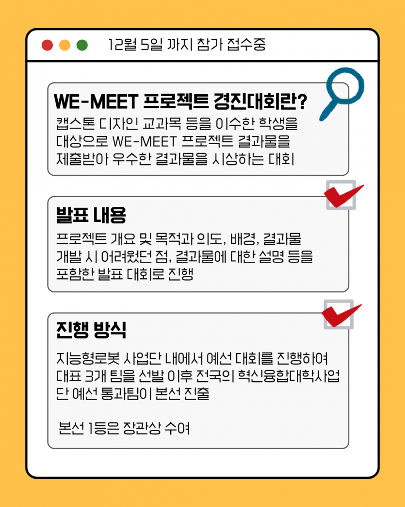 WE-MEET 경진대회 2025년 12월 5일 까지 참가접수 페이지 정보 작성자 지능형로봇사업단 댓글 0건 조회 6회 작성일 25-11-23 21:50 목록 본문 관련링크 https://www.instagram.com/p/DRZjm-WE11F/?utm_source=ig_web_copy_link&i… 1회 연결 이전글생성형 AI를 활용한 캐릭터 공모전 대구지역 참여 후기 25.11.23 다음글#생성형AI 캐릭터 공모전 공모작 제출 후기✨ 25.11.19 댓글 0 댓글목록 등록된 댓글이 없습니다.