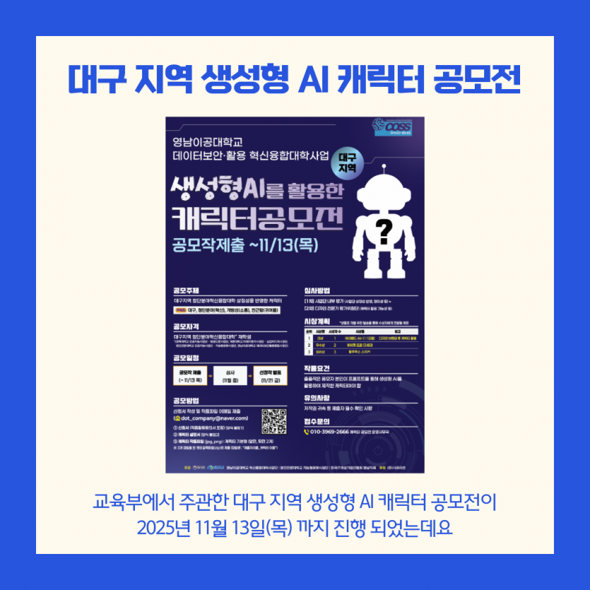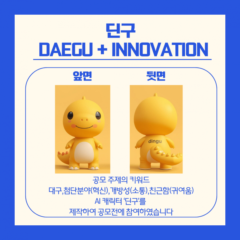 생성형 AI를 활용한 캐릭터 공모전 대구지역 참여 후기 페이지 정보 작성자 지능형로봇사업단 댓글 0건 조회 8회 작성일 25-11-23 21:51 목록 본문 관련링크 https://www.instagram.com/p/DRZj-tYk7dC/?utm_source=ig_web_copy_link&i… 1회 연결 이전글<AI x 소프트웨이브 2025 미리보기> 25.11.24 다음글WE-MEET 경진대회 2025년 12월 5일 까지 참가접수 25.11.23 댓글 0 댓글목록 등록된 댓글이 없습니다.