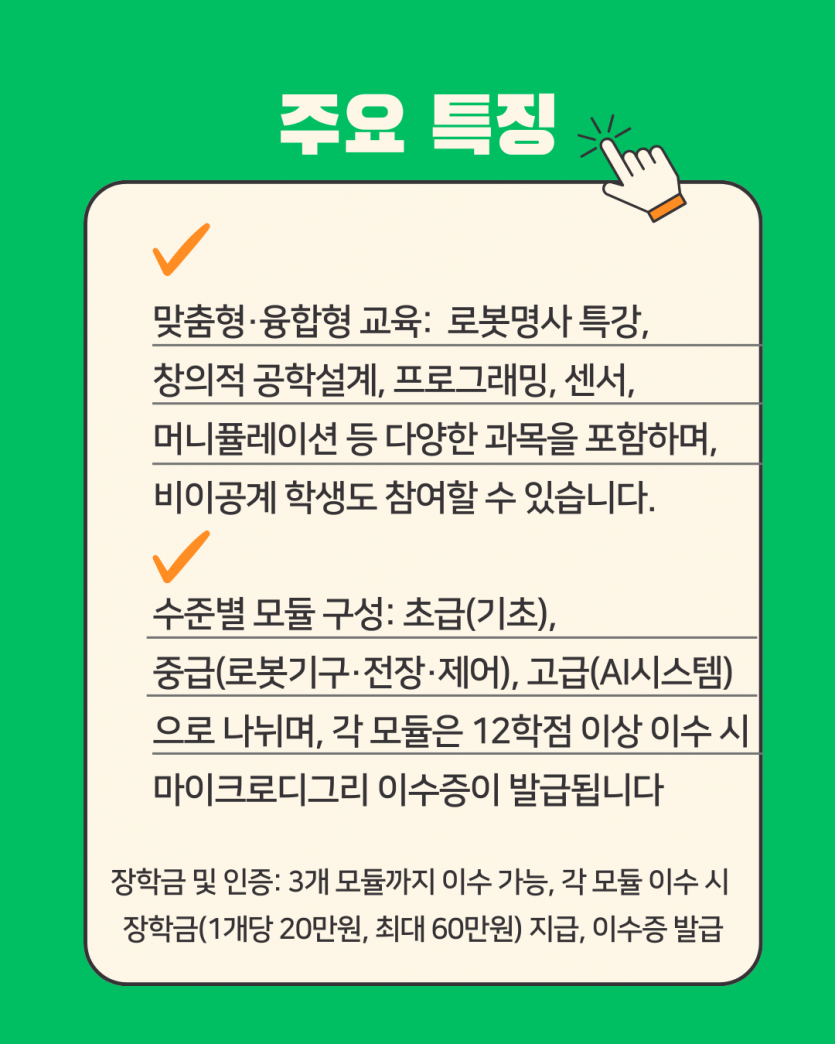 지능형 로봇 마이크로 디그리 장학금 페이지 정보 작성자 지능형로봇사업단 댓글 0건 조회 7회 작성일 26-01-23 12:56 목록 본문 관련링크 https://www.instagram.com/p/DT1n6yfEvbl/?utm_source=ig_web_copy_link&i… 4회 연결 이전글엔비디아가 선택한 AI추론 Groq 26.01.23 다음글LG전자, 홈로봇 'LG클로이드' 26.01.23 댓글 0 댓글목록 등록된 댓글이 없습니다.