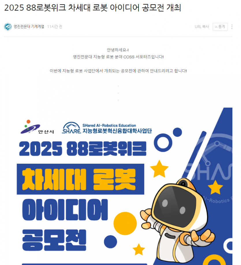 2025 88로봇위크 차세대 로봇 아이디어 공모전 개최 페이지 정보 작성자 지능형로봇사업단 댓글 0건 조회 36회 작성일 25-09-23 00:23 목록 본문 관련링크 https://blog.naver.com/yju_mech/224017320710 17회 연결 이전글대구 첨단분야 융합스쿨 개최 25.09.23 다음글2025년 대구 첨단분야 융합 스쿨 25.09.22 댓글 0 댓글목록 등록된 댓글이 없습니다.